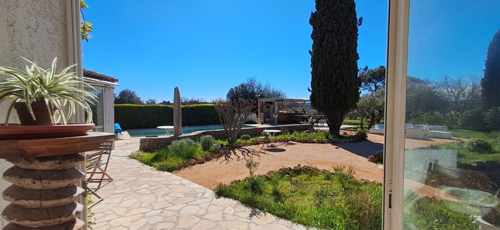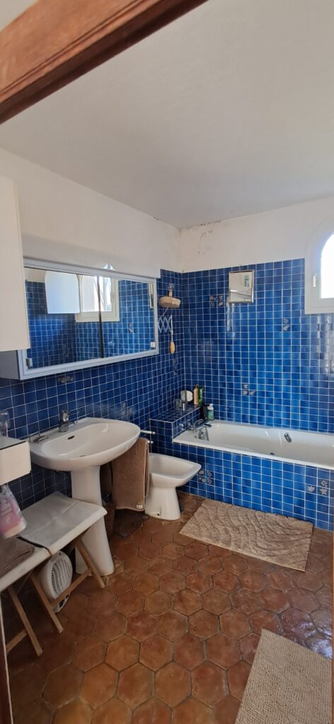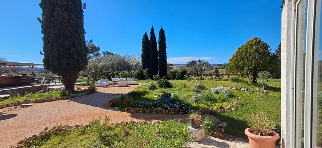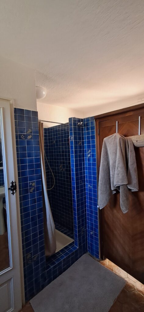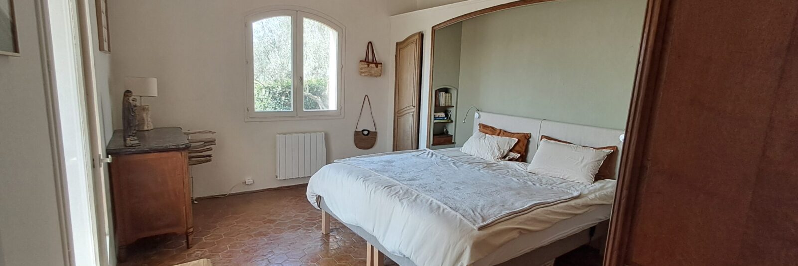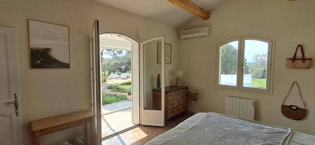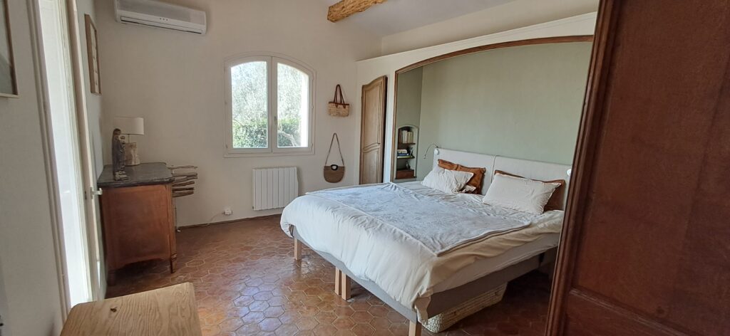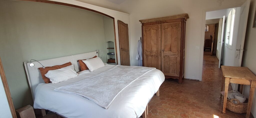 Notre première chambre avec son lit king size 180×200 cm et ses sommiers électriques de relaxation pour une détente musculaire optimale. Avec sa salle de bain tout confort baignoire douche et lavabo .Au lever du soleil en ouvrant les volets vous apprécierez le calme de la nature et le champ des cigales, avec  une vue époustouflante donnant sur le jardin et la piscine,en dégustant votre café ou thé dans la véranda ou la terrasse,ce qui vous procura toute l’énergie pour cette nouvelle journée.