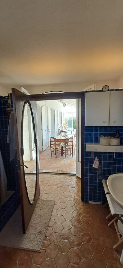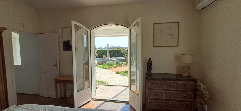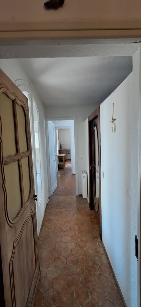 Vu du fond de la chambre au fond du couloir vous avez le hall d’entrée.