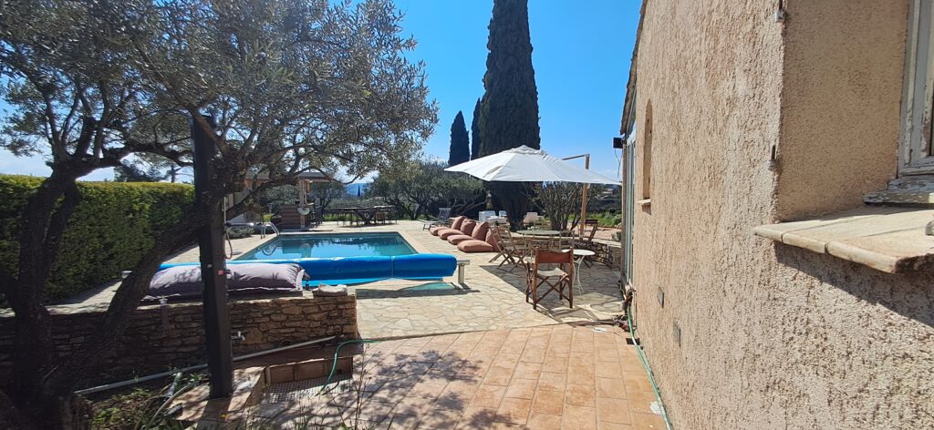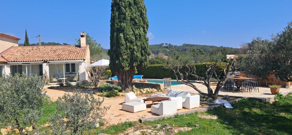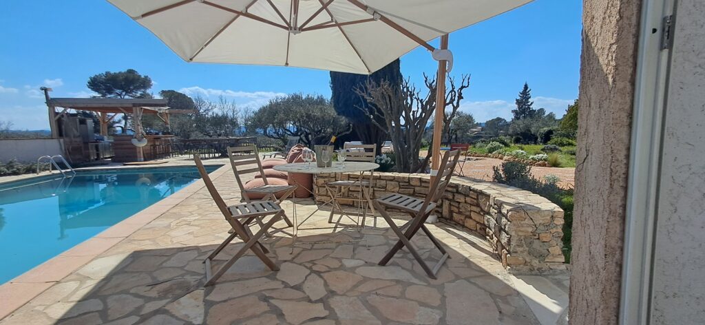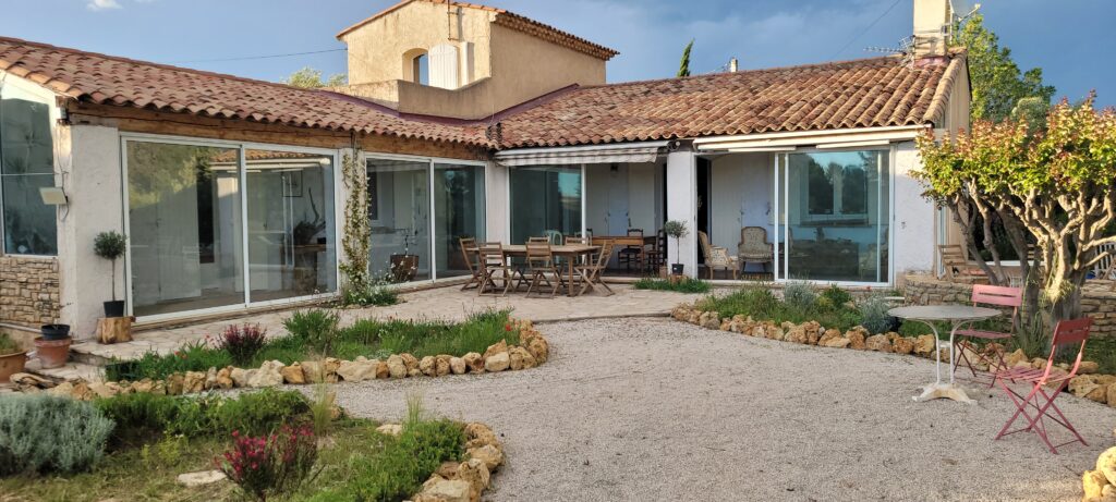 Vu de la maison avec sa terrasse, pour les repas entre amis.