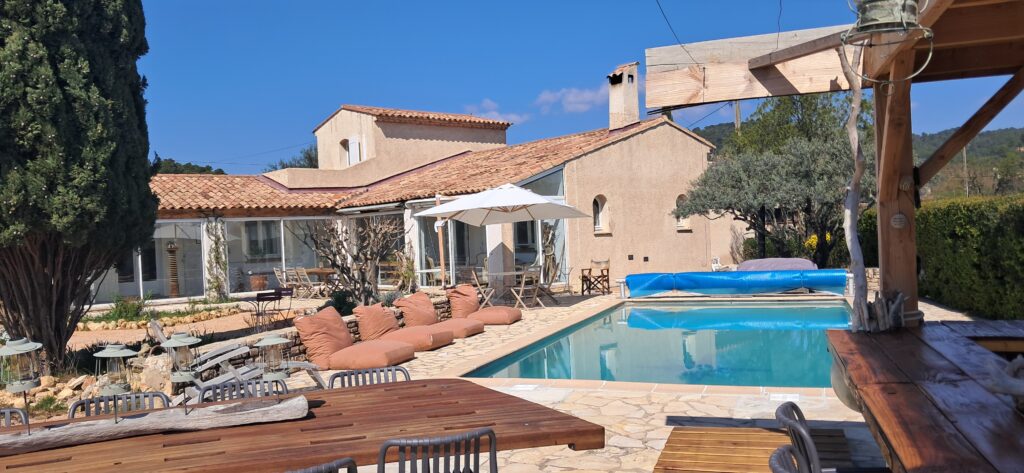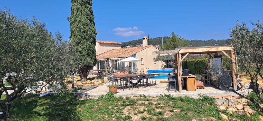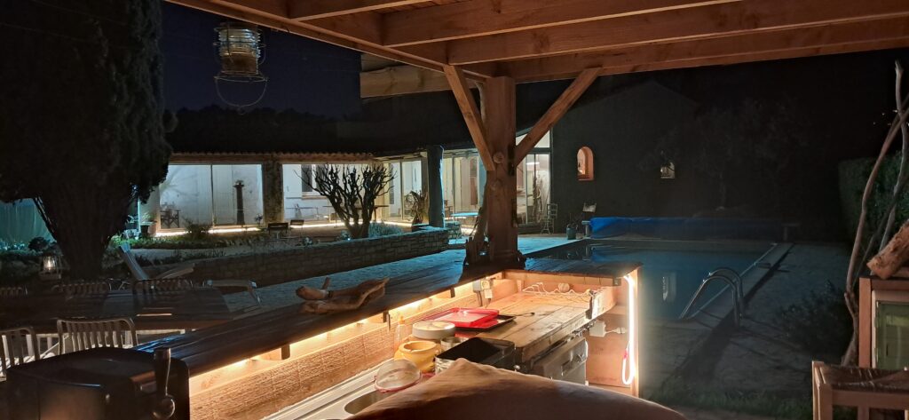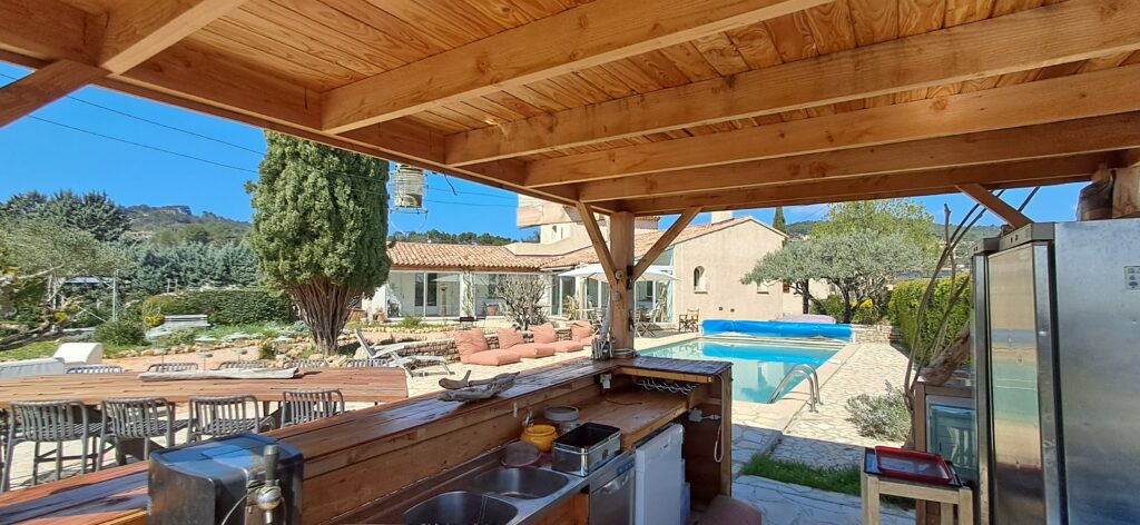 Au cœur de la propriété, cette cuisine extérieure devient le centre vibrant de la maison : généreuse, parfaitement équipée, pensée pour recevoir sans contrainte. Sa large terrasse, avec sa table à manger atypique, accueille les repas du midi ou du soir pour un grand nombre de convives.